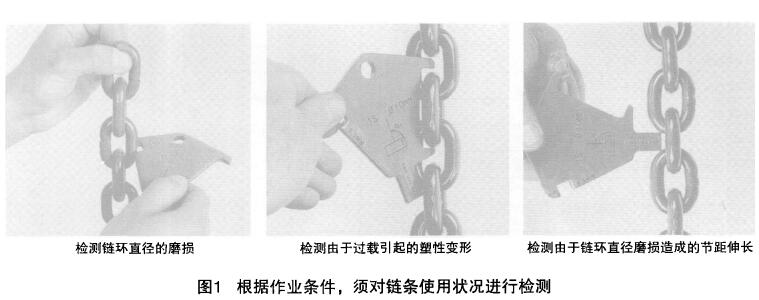 (3)檢查鏈環(huán)磨損及伸長(zhǎng):用生產(chǎn)廠商提供的標(biāo)牌進(jìn)行簡(jiǎn)單檢測(cè) (見圖1 ) 。