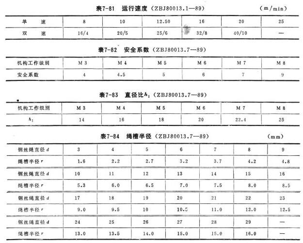 4、滑輪:滑輪直徑與鋼絲繩直徑的比值h2應(yīng)不小于表7-85的規(guī)定。平衡滑輪直徑與鋼絲繩直徑的比值應(yīng)不小于0.6h2?;喗M應(yīng)有防止鋼絲繩跳出繩槽的裝置。滑輪不得有毛刺、缺損等。