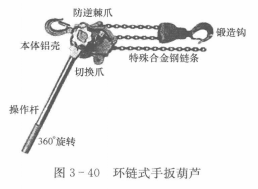 1、環(huán)鏈式手扳葫蘆(見圖3-40)??堪鈩邮直?,通過傳動機構帶動起重鏈條升降重物。環(huán)鏈式手不安葫蘆是設備安裝,貨物起吊、物體固定、綁扎和牽引的理想工具,尤其是任意角度的牽引和在場地狹小,露天作業(yè)及無電源的情況下,更顯示其優(yōu)越性。