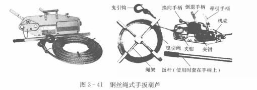 2、鋼絲繩式手扳葫蘆。鋼絲繩式手扳葫蘆(見圖3-41),又稱橫向牽引機,它不但能作一般牽引、卷揚、起重工作。而且還能在傾斜高低不平的狹窄地帶和曲折轉彎的條件下進行工作。