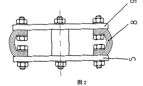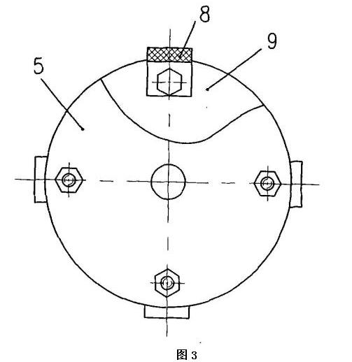 該電動葫蘆采用獨(dú)特的設(shè)計(jì),利用手拉葫蘆和煤電鉆相結(jié)合,其手拉葫蘆的手拉轉(zhuǎn)輪上沒有纏繞搭接手拉鏈,煤電鉆包括機(jī)殼和卡裝在煤 電鉆的卡具上的鉆桿,手拉轉(zhuǎn)輪與鉆桿同軸設(shè)置,手拉轉(zhuǎn)輪朝外的端面朝向煤電鉆,殼體和機(jī)殼采用固定架固定相連,手拉轉(zhuǎn)輪朝外的端面上固定有手拉轉(zhuǎn)輪法蘭盤,手拉轉(zhuǎn)輪法蘭盤上均布有多個螺栓孔,每個螺栓孔處采用緊固件分別與一個皮帶條的一端固定相連,每個皮帶條的另一端通過鉆桿法蘭盤上的螺栓孔采用緊固件連接固定在鉆桿法蘭盤上,鉆桿法蘭盤上的螺栓孔位置與手拉轉(zhuǎn)輪法蘭盤上的螺栓孔位置對應(yīng),鉆桿法蘭盤安裝固定在鉆桿的端頭上。在使用時(shí),當(dāng)需要起吊重物時(shí),可利用煤電鉆的電機(jī)帶動鉆桿按照需要的方向旋轉(zhuǎn),鉆桿就會通過鉆桿法蘭盤、多個皮帶條8和手拉轉(zhuǎn)輪法蘭盤帶動手拉葫蘆的手拉轉(zhuǎn)輪按照需要的方向轉(zhuǎn)動,從而完成對重物的起吊。由于采用皮帶條這種軟連接設(shè)計(jì)將煤電鉆的電機(jī)產(chǎn)生的扭矩傳遞到手拉葫蘆的手拉轉(zhuǎn)輪,保證了手拉葫蘆轉(zhuǎn)動的平穩(wěn)性,再由于煤電鉆的輸出轉(zhuǎn)速較低,不需要另加減速裝置,故本發(fā)明的利用手拉葫蘆和煤電鉆改造成的電動葫蘆的結(jié)構(gòu)非常緊湊,體積也較小,尤其適宜井下機(jī)電硐室起吊、裝卸設(shè)備和物件、以及安撤面使用,并可降低工人勞動強(qiáng)度,提高工作效率。