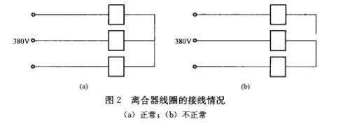 從圖2(a)可以看出,正常的情況下,3個(gè)線圈的電壓都是220V,3個(gè)線圈都能正常地吸合,離合器也能正常的離合,上升和下降時(shí)電動(dòng)機(jī)能正常地工作,但在有一個(gè)線圈的一端脫離中點(diǎn)后,中點(diǎn)就不存在了,見(jiàn)圖2(b)。3個(gè)線圈中,一個(gè)線圈沒(méi)有電壓,另兩個(gè)線圈的電壓為380/2V=190V,每個(gè)線圈雖說(shuō)有190V,但這兩個(gè)線圈是串聯(lián)的,不能保證兩個(gè)線圈的阻抗是相等的,這時(shí)3個(gè)線圈都不可能正常地工作,造成了離合器不能正常地勤離合。離合器的工作不正常,就造成了電動(dòng)葫蘆上升和下降時(shí)的阻力增大,電動(dòng)機(jī)就不能正常的工作工作,電動(dòng)葫蘆就不可能正常的上升和下降了。