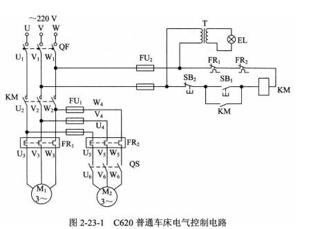 C620普通車床電氣控制電爐如圖2-23-1所示,M1,M2為容量小于10kw的電動機,采用全壓直接起動,均為單方向旋轉。M1由接觸器KM實現(xiàn)起動、停止控制,M2由轉換開關QS控制。M1、M2分別由熱繼電器FR1、FR2實現(xiàn)電動機長期過載保護,由熔斷器FU1、FU2實現(xiàn)M2電動及、控制電爐及照明電爐的短路保護。照明電爐由變壓器T供給電壓,控制照明燈
