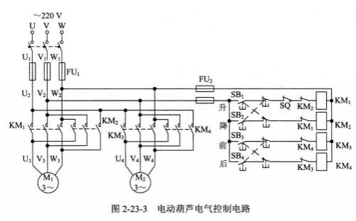 如圖2-23-3所示為電動葫蘆電氣控制電路圖。提升電動機M1由上升、下降接觸器KM1、KM2控制,移動電動機M2由向前、向后接觸器KM3、KM4控制。它們都由電動葫蘆懸掛按鈕站上復式按鈕SB1-SB4實現(xiàn)電動控制,SQ為提升行程開關。