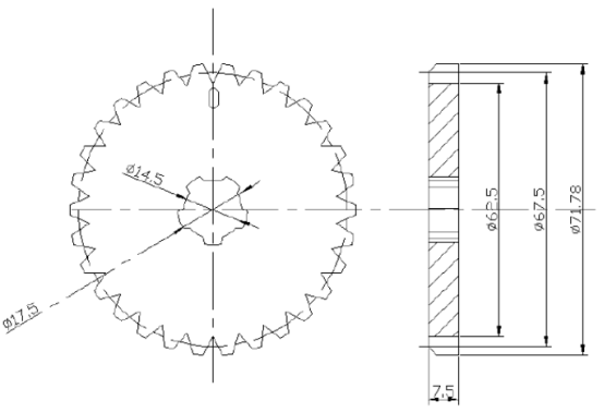 根據(jù)葫蘆傳動齒輪低速重載,根據(jù)手拉葫蘆傳動結(jié)構(gòu)的原理由五尺長軸的小齒輪帶動片齒輪甲、乙,考慮到五尺長軸的小齒輪齒數(shù)甚小等特點(diǎn),1.5型葫蘆選用了齒形角20°的漸開線特種片齒輪變位齒輪,其基本齒形的基本參數(shù)如圖所示。選用齒形是考慮了以下因素:1.5t葫蘆傳動齒輪的小齒輪齒數(shù)甚少為了避免根切和增強(qiáng)度,只能用正變位切削這樣小齒輪的外圓就受齒條的正切力,片齒輪與短軸屬于過硬配合,片齒輪的中心要設(shè)計出與短軸尺寸屬于硬配合的小花鍵孔尺寸如圖所示: