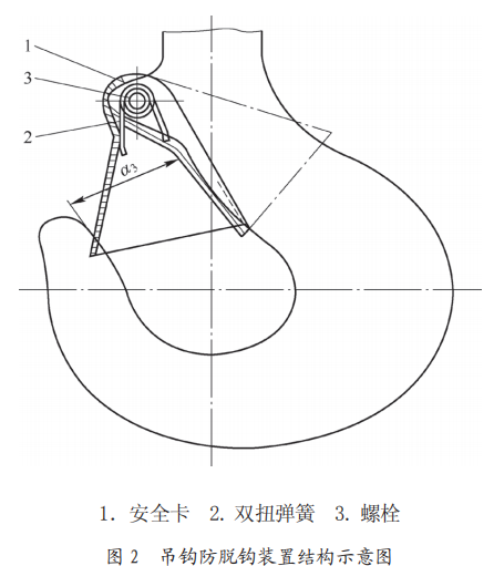 吊鉤防脫鉤裝置:該吊鉤防脫鉤裝置為卡片式結(jié)構(gòu),該裝置由安全卡、雙扭彈簧、螺栓組成,如圖2所示。經(jīng)現(xiàn)場檢查,事發(fā)后安全卡處于吊鉤開口以外非正常工作位置。安全卡長110mm,款39mm,安全卡無明顯變形,雙扭彈簧功能有效,螺栓緊固完好。通過將安全卡恢復(fù)到正常工作位置后手動(dòng)測試,安全卡動(dòng)作復(fù)位靈活,防脫鉤裝置具備正常防脫鉤功能。