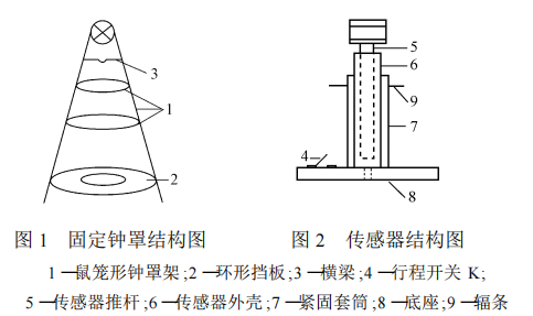 傳感器外殼固定在套筒上,底座則與套筒固定在一起、三者連為一體。設(shè)置環(huán)形擋板和輻條是因?yàn)樵陔妱?dòng)葫蘆制動(dòng)后,底座和重物砣由于受到自身重力的作用,必然要下滑一段距離,當(dāng)?shù)鬃禄絺鞲衅魍茥U端部時(shí),輻條碰住環(huán)形擋板上表面,底座停止下滑,這樣可避免將推桿從傳感器外殼中拉出。同時(shí),環(huán)形擋板還起著在底座上升時(shí)閉合行程開(kāi)關(guān)的作用。因此,環(huán)形擋板和輻條的安放位置十分關(guān)鍵。環(huán)形擋板的位置應(yīng)保證在測(cè)試過(guò)程中重物饦推動(dòng)底座上升到行程開(kāi)關(guān)碰住環(huán)形擋板底部時(shí),傳感器端部與底座之間仍有一微小距離,這樣就防止了底座撞擊傳感器端部而損壞傳感器。輻條的位置應(yīng)保證底座下滑到碰到環(huán)形擋板時(shí),推桿剛好到達(dá)傳感器大位置且未從外殼中拉出。