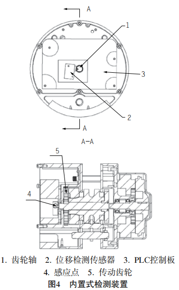 內(nèi)置式高度檢測裝置如圖4所示,它主要由齒輪軸、位移檢測傳感器和PLC控制板組成。齒輪軸位于電動葫蘆內(nèi),齒輪軸貫穿PLC控制板,PLC控制板上設有位移檢測傳感器,位移檢測傳感器位于齒輪軸旁,PLC控制板與位移檢測傳感器電連接,齒輪軸上設有感應點,感應點與位移檢測傳感器配合。根據(jù)不同葫蘆的結構,在葫蘆電機的齒輪軸上,布置一個凸起或凹陷的感應開關感應點用于檢測該軸的轉(zhuǎn)動圈數(shù)。電動葫蘆必須配置控制的PLC或單片機,用于處理感應開關檢測到軸的轉(zhuǎn)動圈數(shù)。每臺環(huán)鏈電動葫蘆會根據(jù)實際鏈條長度,預先在程序中設定好鏈條的首位限位點。PLC或單片機程序設定好檢測的軸與起重鏈條運行距離的比例,再根據(jù)檢測軸轉(zhuǎn)動的圈數(shù)計算出鏈條運行的距離,實時計算出吊鉤的高度,當鏈條運行到限位點時會自動停機,起到限位的作用。