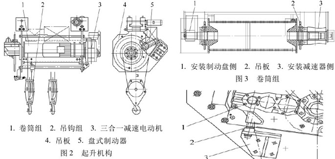 起升機(jī)構(gòu)采用三合一減速電動(dòng)機(jī),通過花鍵軸驅(qū)動(dòng)卷筒組,卷筒組上設(shè)有電磁盤式安全制動(dòng)器,用于保證在起升機(jī)構(gòu)故障時(shí)閘住卷筒,保證載荷不墜落。結(jié)構(gòu)上用2吊板將卷筒組吊掛起來,減速器力矩支撐、制動(dòng)器、安全保護(hù)裝置等均安裝在吊板上。起升機(jī)構(gòu)見圖2。