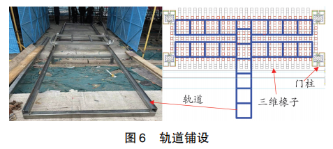 (1) 軌道鋪設(shè):如圖6所示,整體軌道為“干”字型,軌道用30mm×30mm×3mm方管縱橫向焊接,橫桿在下、縱桿在上,為防止脫軌,在縱向邊緣用5mm×5mm×2mm小方管焊制防脫軌擋板,在高低跨處焊接支腿支撐,為了便于沿屋面X方向移動,在屋面下方焊接X向軌道,由Y向軌道運輸至屋面下方,垂直方向調(diào)換位置進行運輸。