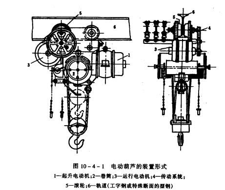 圖10-4-1所示,兩臺(tái)電動(dòng)機(jī)各自驅(qū)動(dòng)其起升機(jī)構(gòu),或運(yùn)行機(jī)構(gòu)的鋼絲繩式的電動(dòng)葫蘆其起升機(jī)構(gòu)由電動(dòng)機(jī)、卷筒及其相應(yīng)的傳動(dòng)系統(tǒng)所構(gòu)成,運(yùn)行機(jī)構(gòu)則包括電動(dòng)機(jī),并通過(guò)傳動(dòng)系統(tǒng)與驅(qū)動(dòng)輪相連,電動(dòng)葫蘆通常沿工字鋼下翼緣的踏面移動(dòng),當(dāng)然,在有些場(chǎng)合下,還可沿具有特殊斷面的軌道運(yùn)行。